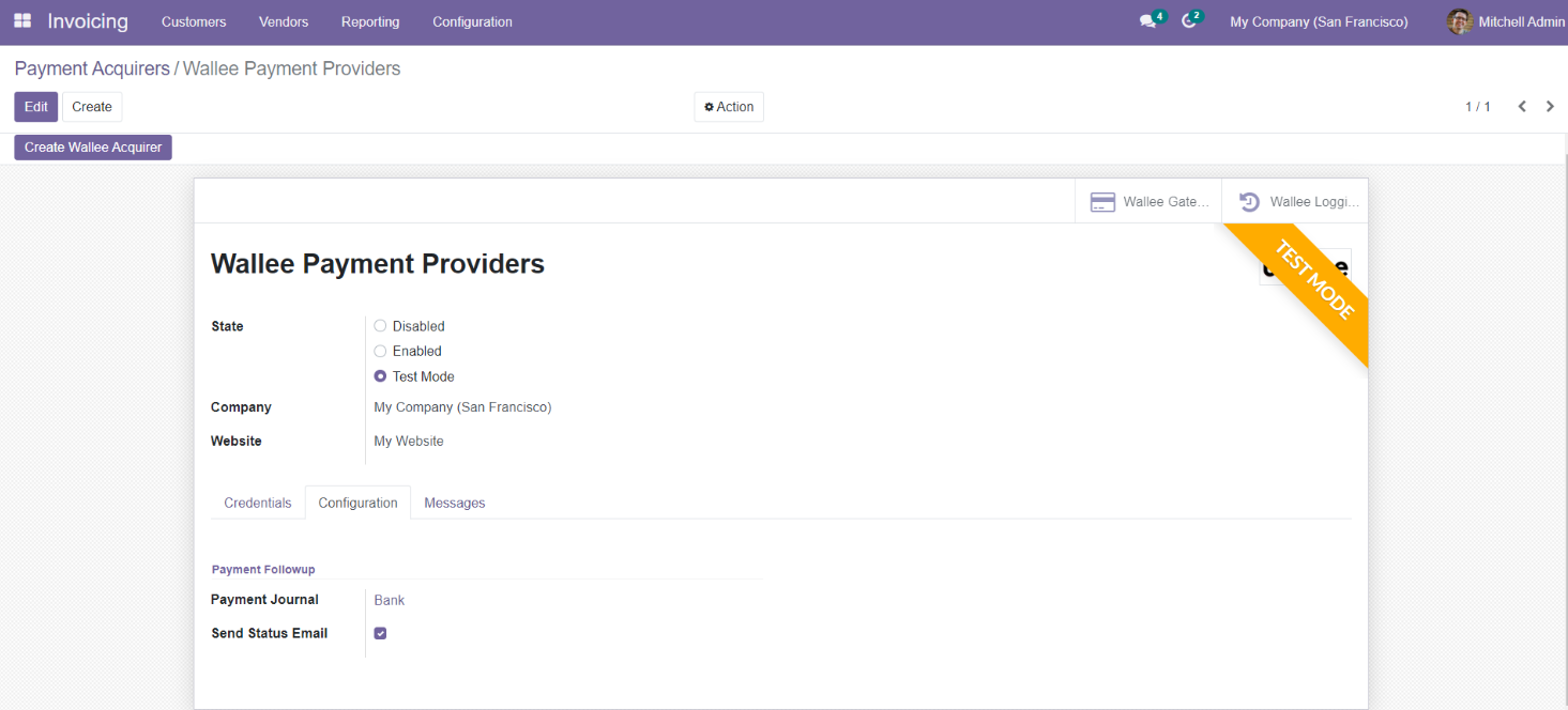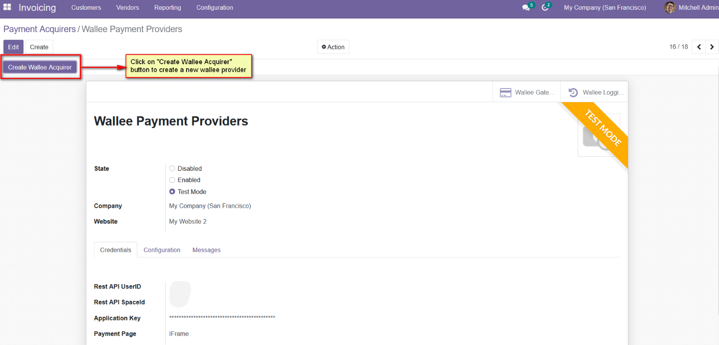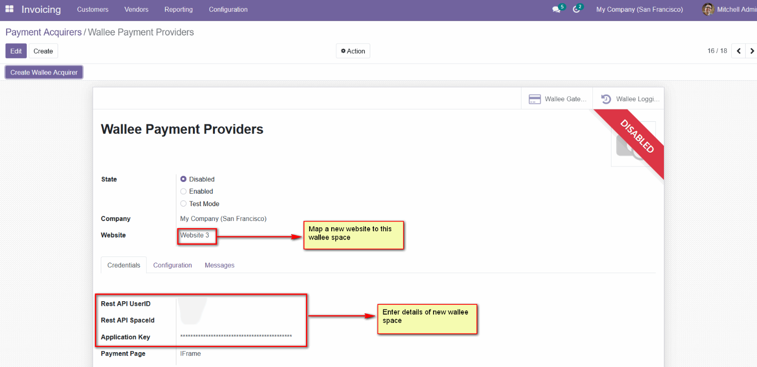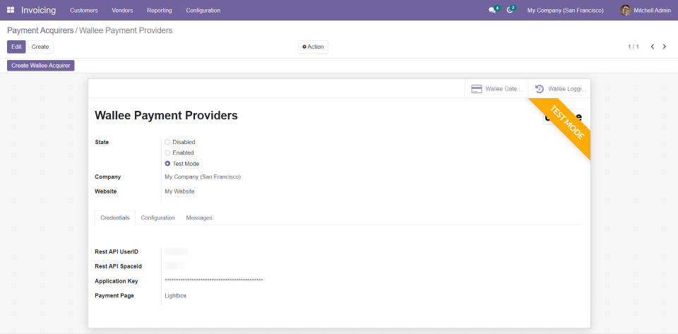 - Add the Wallee credentials (Rest API UserID, Rest API SpaceID, Application Key) in the Wallee payment provider record in the Odoo backend configuration.
