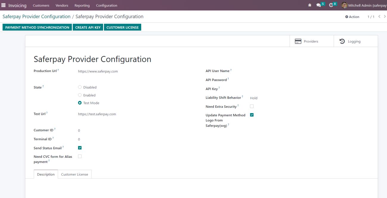- Customer License: Fetches license package and feature details from Saferpay and adds them under Invoicing → Configuration → Saferpay Provider Configuration → Customer License.