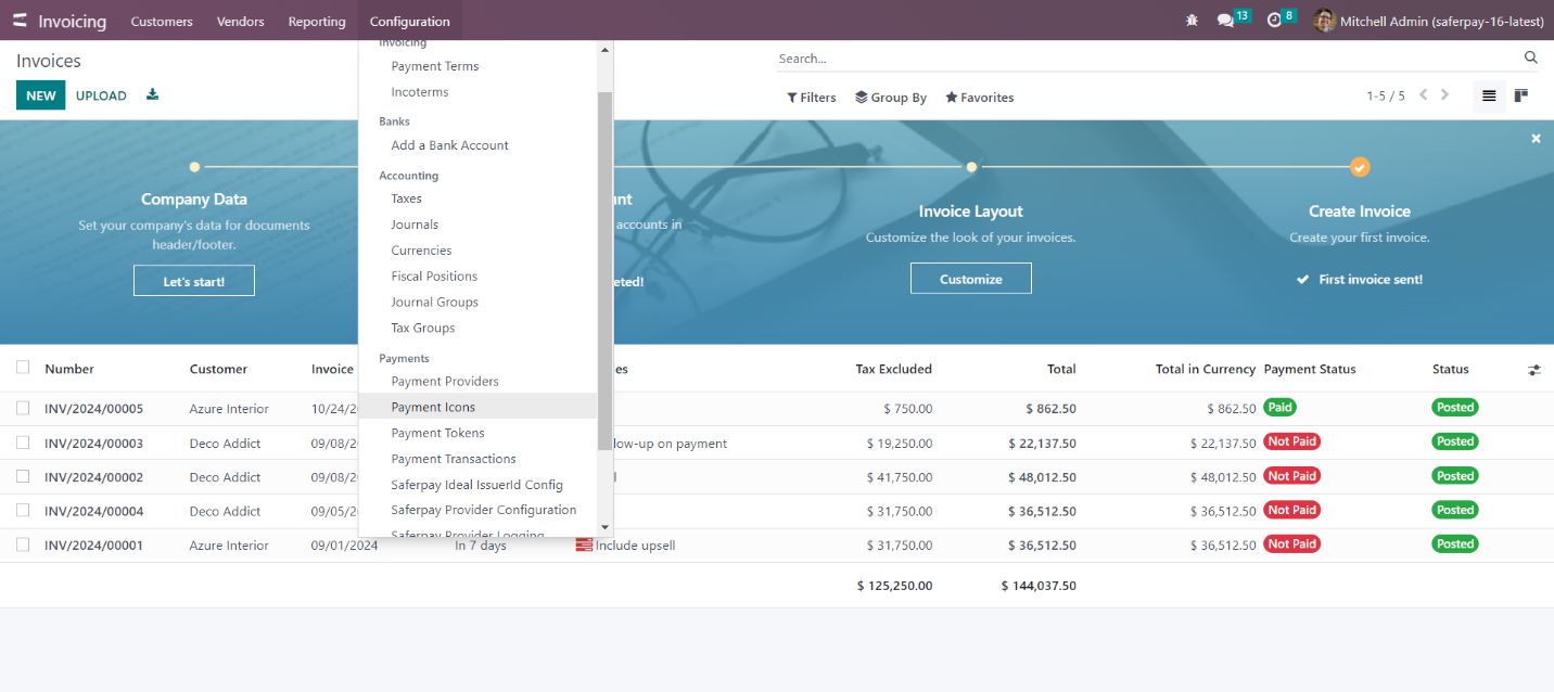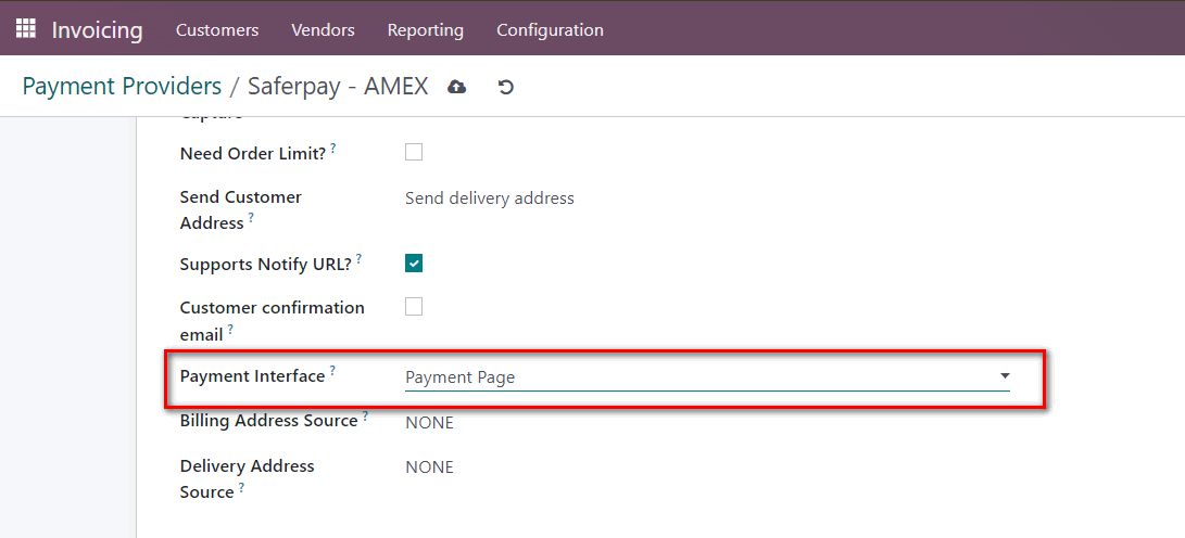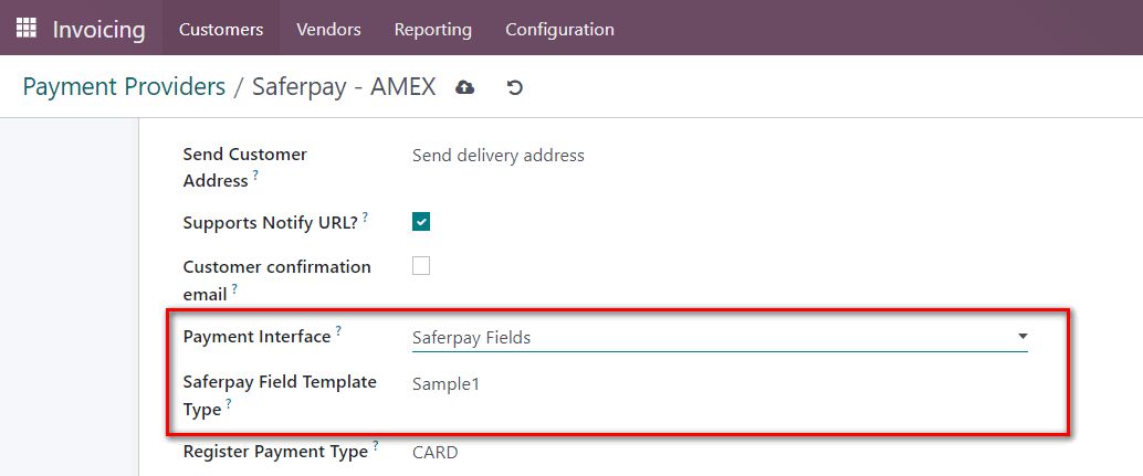 - Navigate to Invoicing → Configuration → Saferpay Provider Configuration to set up Saferpay data: