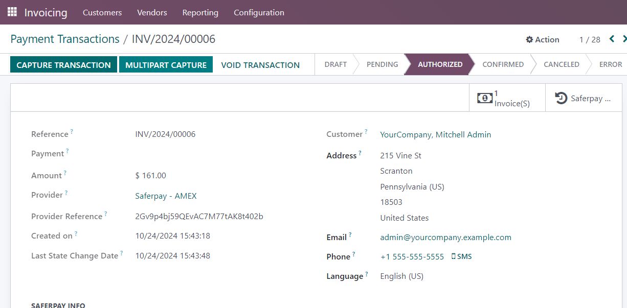 This Odoo module enables compatibility with Saferpay, supporting the following payment methods and workflows: