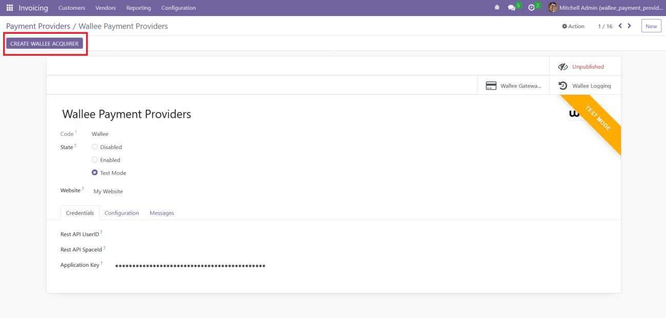 Clicking the “Create Wallee Provider” button will generate a new Wallee provider in Odoo with a unique name.