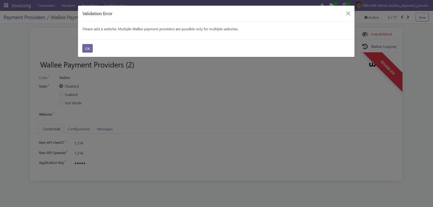 - Duplicate Website and Space ID Combination: If a provider with the same combination of Website and Space ID is already configured, the system will raise a warning. This prevents duplication and ensures consistency across payment configurations.