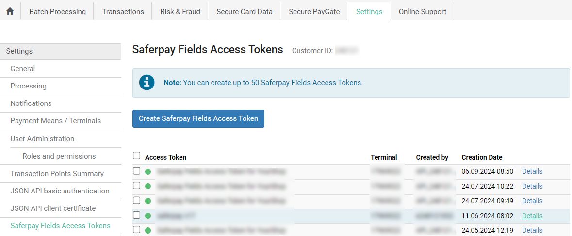 You can generate new API Tokens in the Saferpay Backoffice by navigating to: Settings → Saferpay Fields Access Tokens.