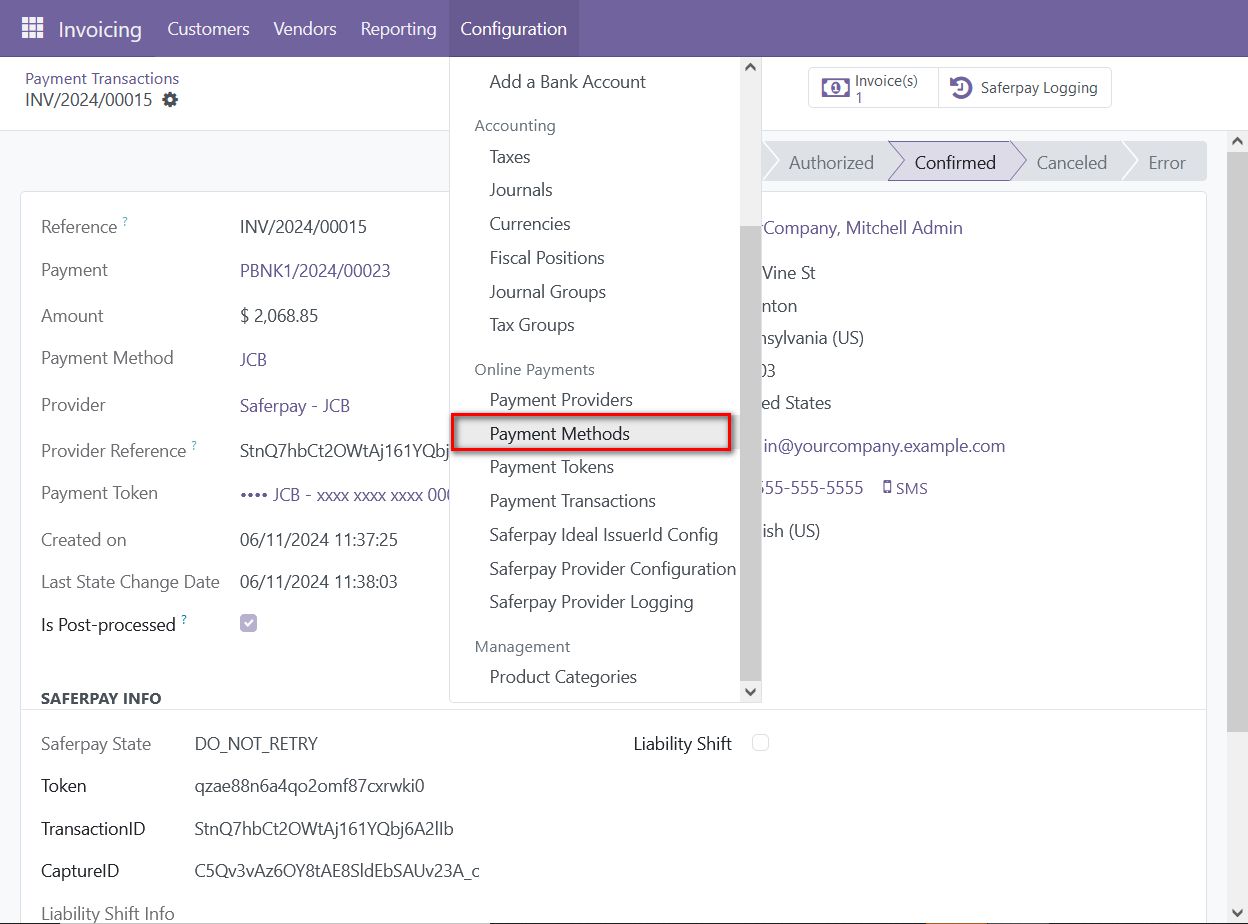 - You can configure Saferpay payment methods by navigating to Invoicing → Configuration → Payment Methods, as shown in the figure. This menu allows you to set up and manage each payment method integrated with Saferpay.