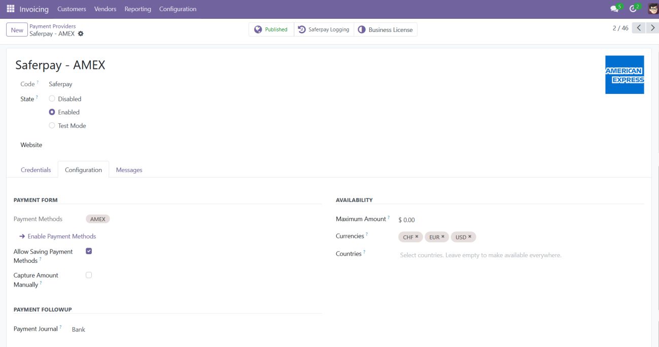 - Navigate to Invoicing → Configuration → Saferpay Provider Configuration to set up Saferpay data: