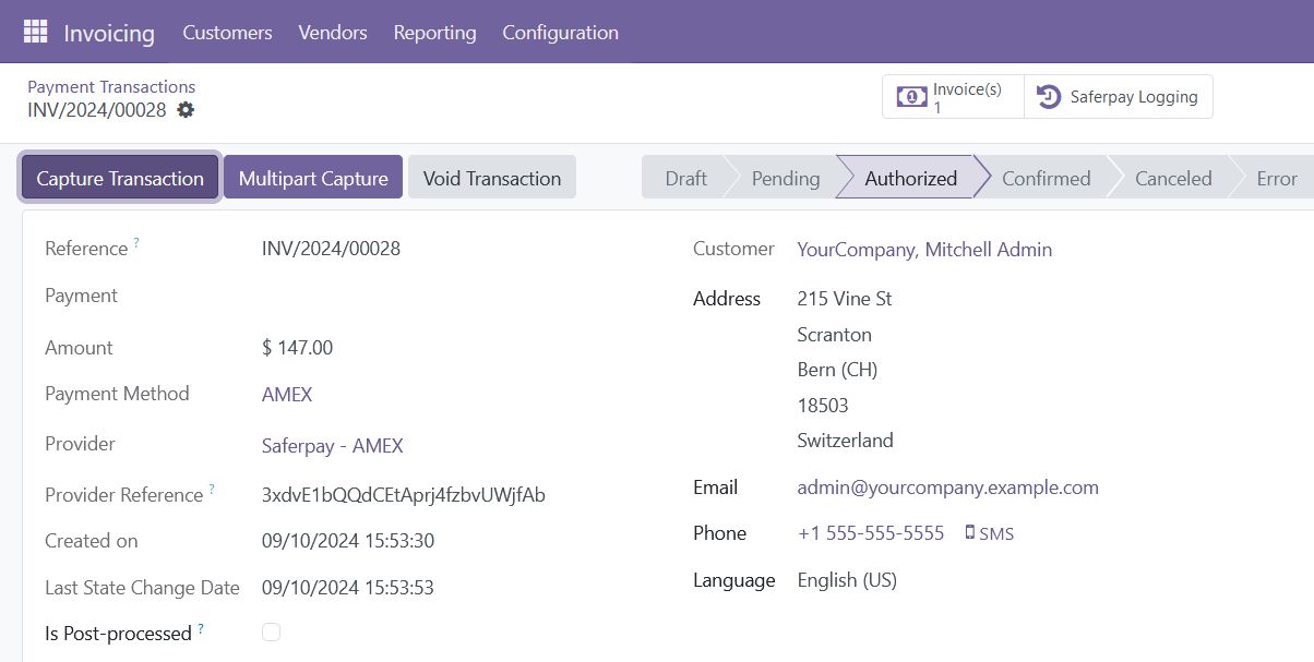 This Odoo module enables compatibility with Saferpay, supporting the following payment methods and workflows: