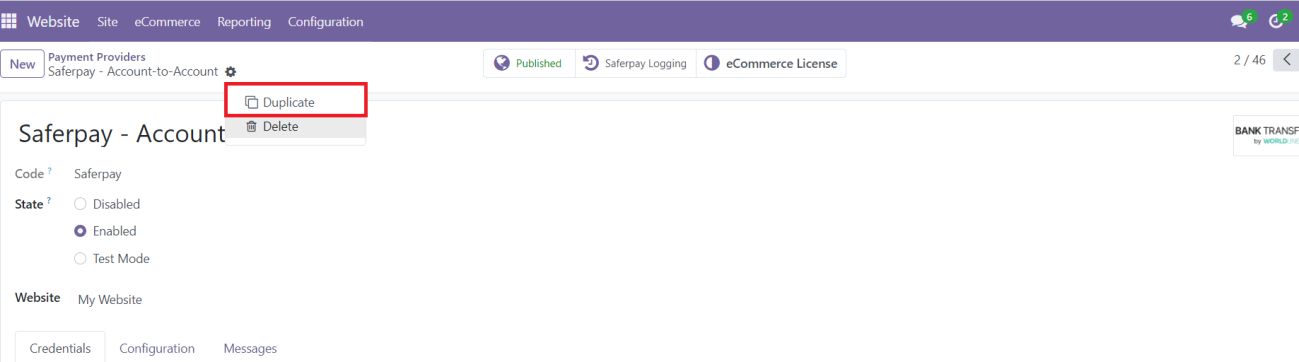 - Multi-Website Configuration: To set up Saferpay for multiple websites, duplicate the Saferpay Provider configuration using the Duplicate button.